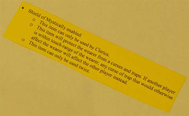 Each adventurer started out with a character sheet. This sheet contained details about their class, secret pass-phrases, and a token needed to solve the mysteries that would be reveled during the evening.